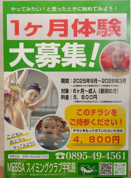 おかげさまで沢山の方が1か月体験に参加していただいております(^^♪申し込み忘れてた!Σ(゚д゚lll)ガーンやってかったけど・・・もう間に合わない?(´;ω;`)ウッ…そんな方!だいじょうぶですよーー(^_-)-☆ご好評につき9月・10月も引き続き1か月体験を実施します\(^o^)/水泳はベビーから大人まで身体にも心にもいいことたくさん♪冬に向かって免疫力アップしていきましょう!!!